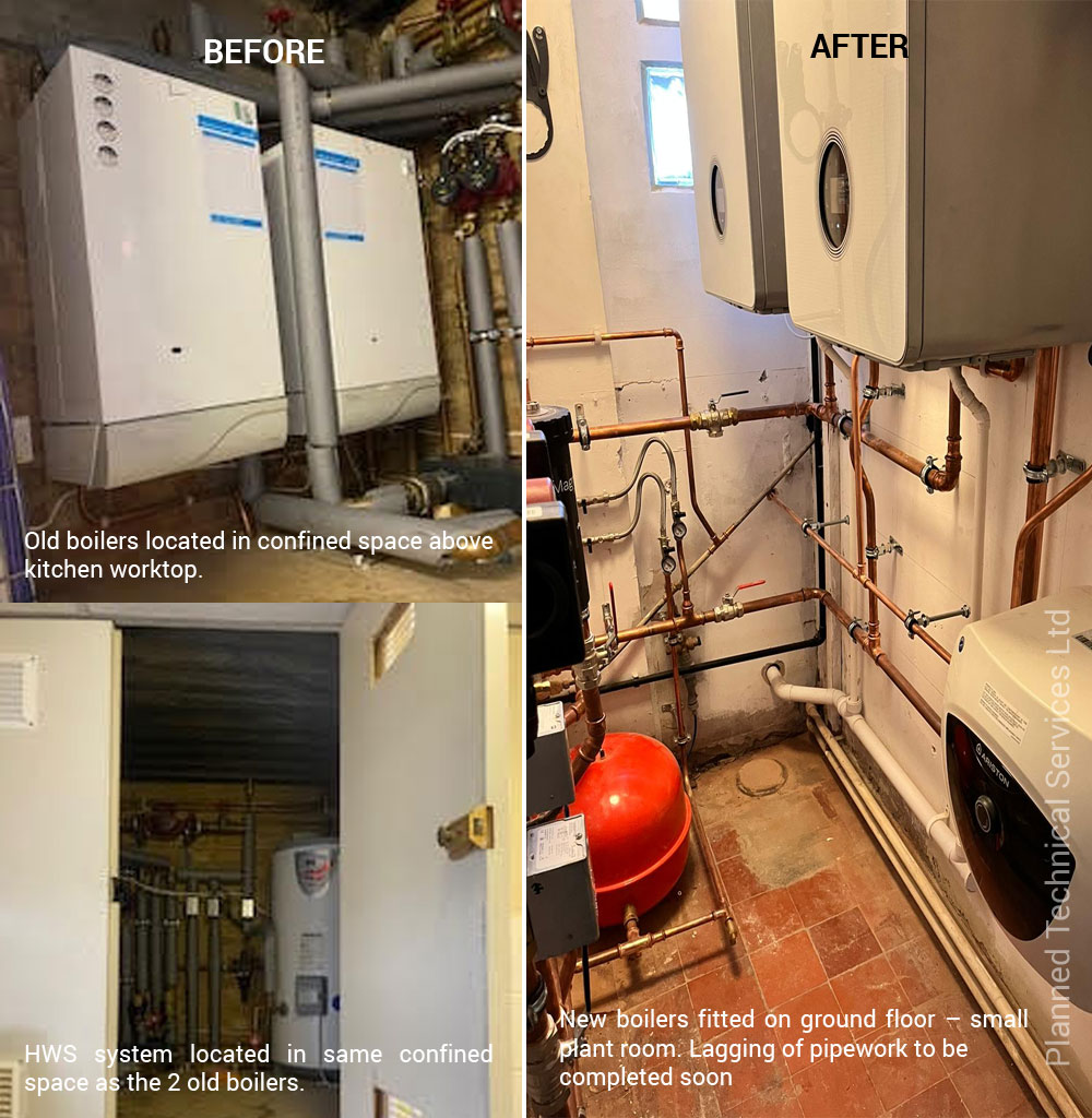 Planned Engineering Services recently carried out the installation of new boilers pumps and controls in a client premises due to issues around the safe maintenance of the existing plant. The plant was located within a small cupboard area on the first floor with the only access directly above the kitchen worktops. The cupboard floor area was also deemed to be not suitable for safe access to work for the maintenance engineers. The new boilers were installed in a suitable enclosure on the ground floor allowing free and safe access for servicing. The pipework was modified to allow services for each floor to be split between the new boilers